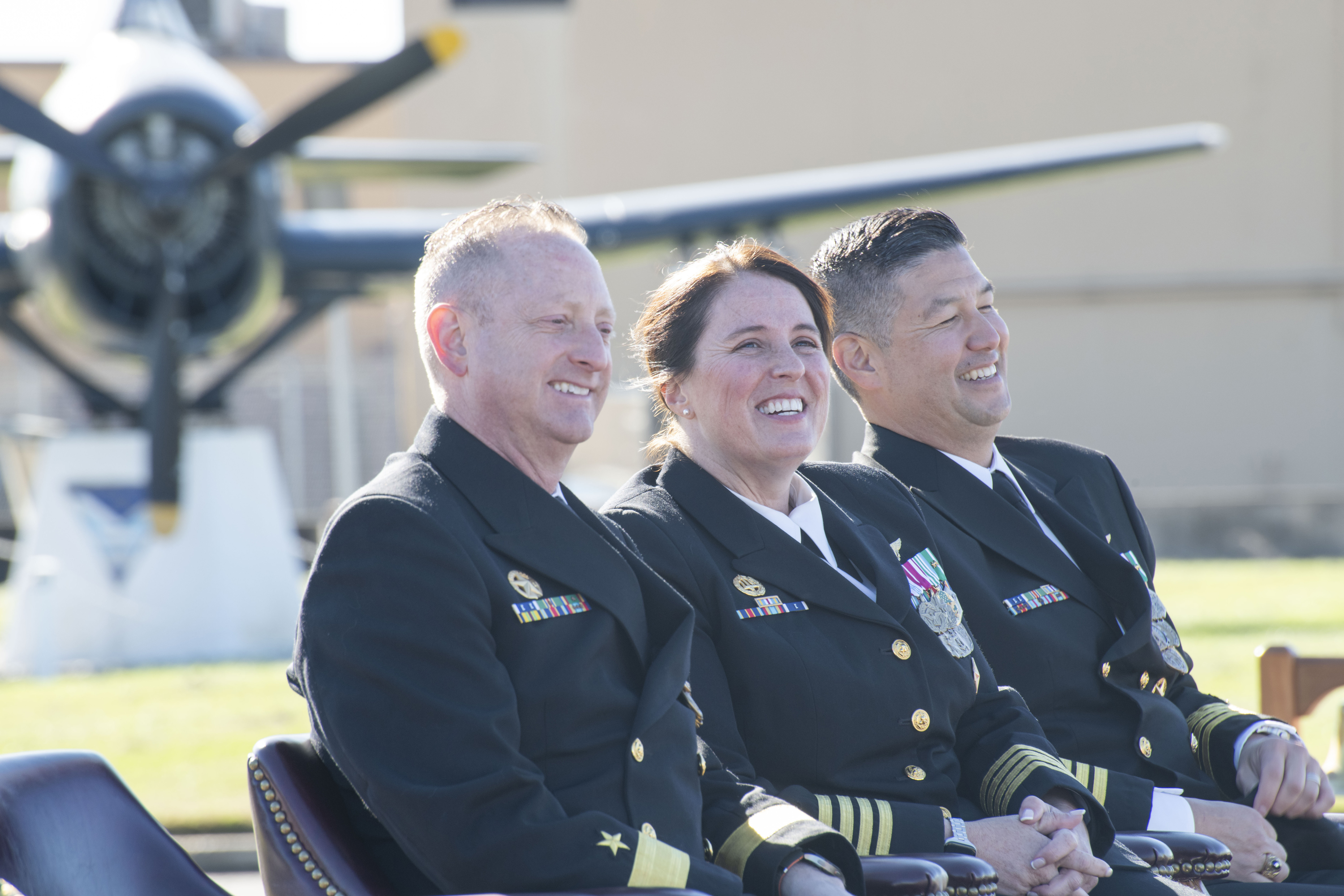 U.S. Navy Rear Adm. John Saccomando, Naval Air Force Reserve deputy commander, Capt. Page Felini, Naval Air Facility Washington commanding officer, and Capt. Christopher K. Lemon, NAFW deputy commander, listen to a speech by retired Rear Adm. Michael J. Steffen at NAFW’s change of command ceremony at Joint Base Andrews, Maryland, Oct. 17, 2025. Lemon assumed command of NAFW from Felini, who retired after 25 years of service. (U.S. Air Force photo by Patrick Griffith)