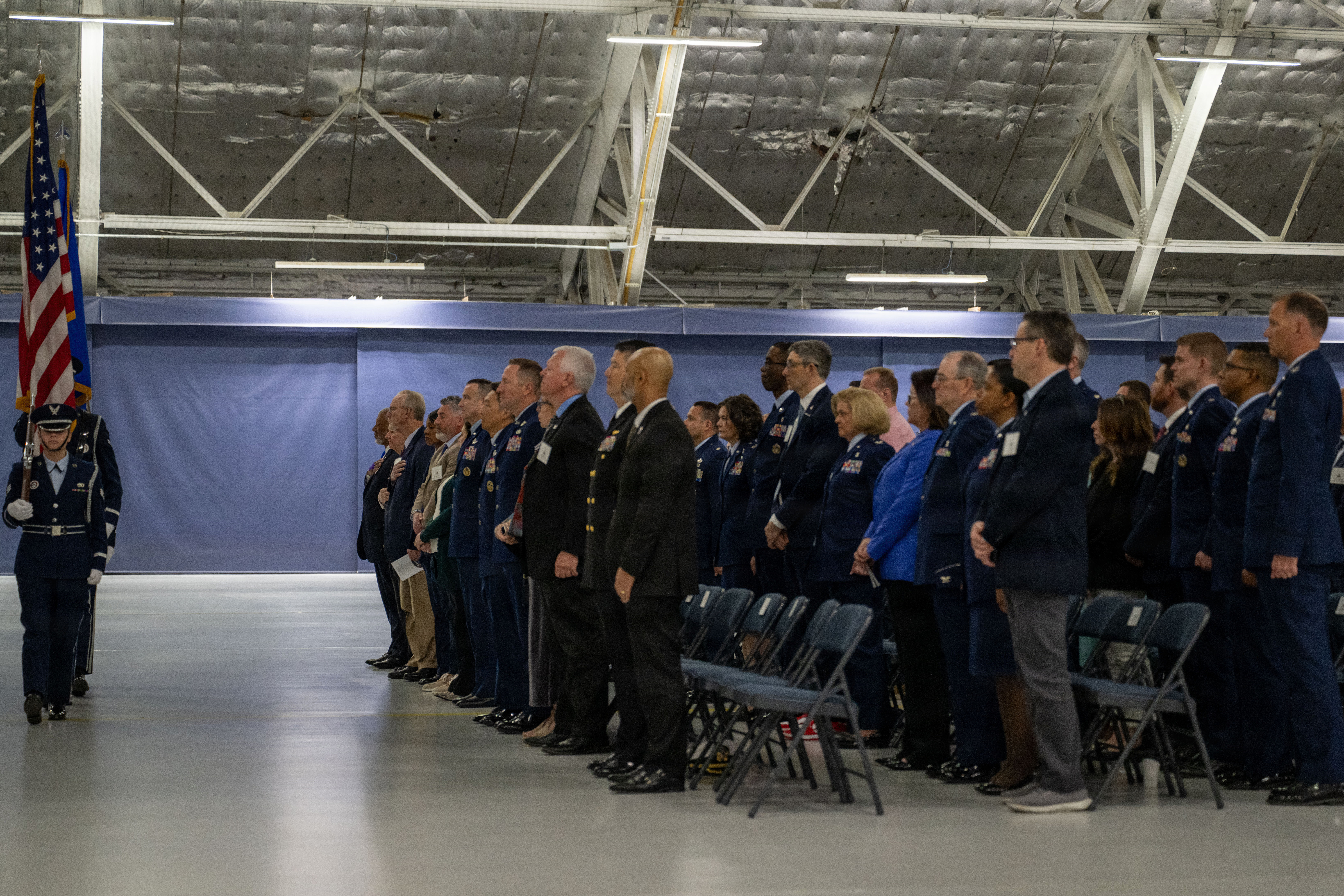 The Joint Base Andrews Honor Guard presents the colors during the 2026 Honorary Commanders Induction Ceremony at Joint Base Andrews, Maryland, April 7, 2026. Honorary commanders are paired one-on-one with commanders assigned to Joint Base Andrews and will be invited to participate in unit ceremonies, base ceremonies, briefings and quarterly base-wide honorary commander engagements. (U.S. Air Force photo by Senior Airman Daniel Walderbach)